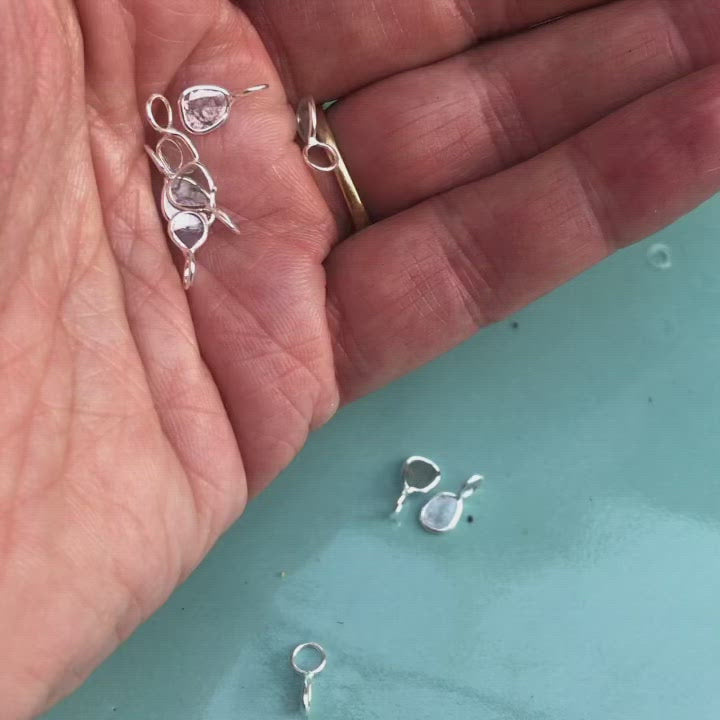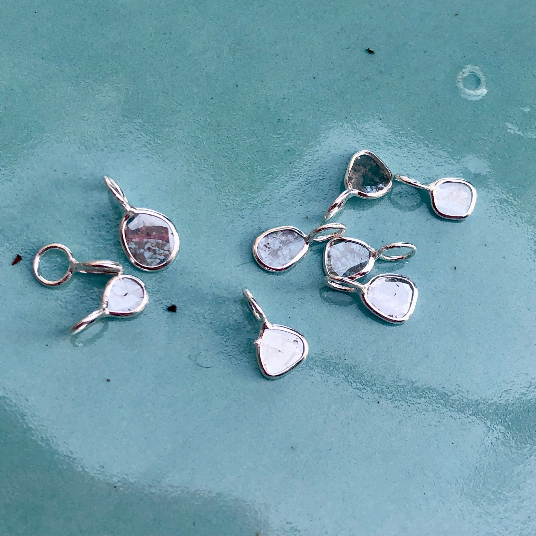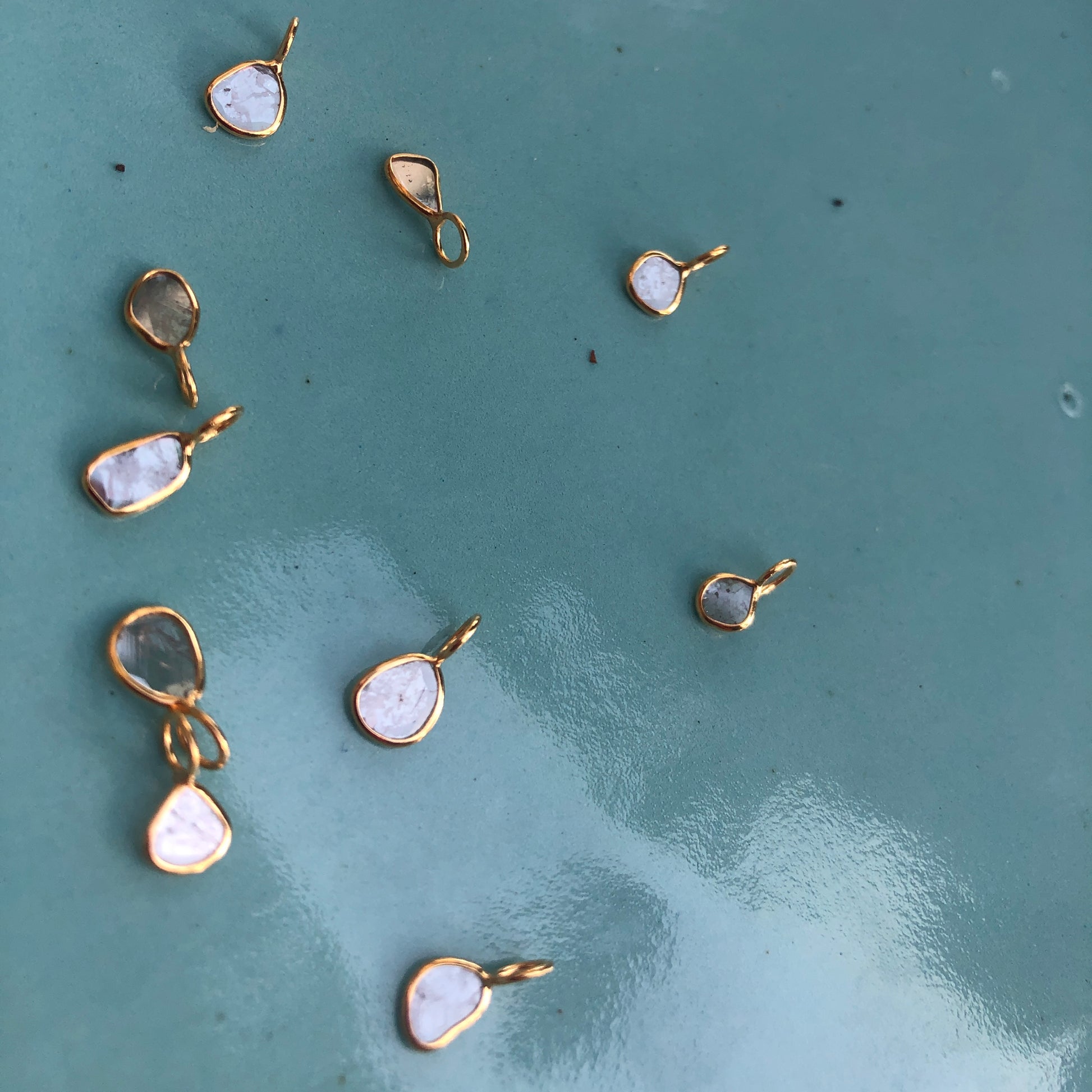 I have just a small few, framed in either gold or silver frames. They are perfect on a hoop or hook as earrings or add them to a fine chain for a little slice of discreet luxury. Each one is unique, they are about 4-6mm in size