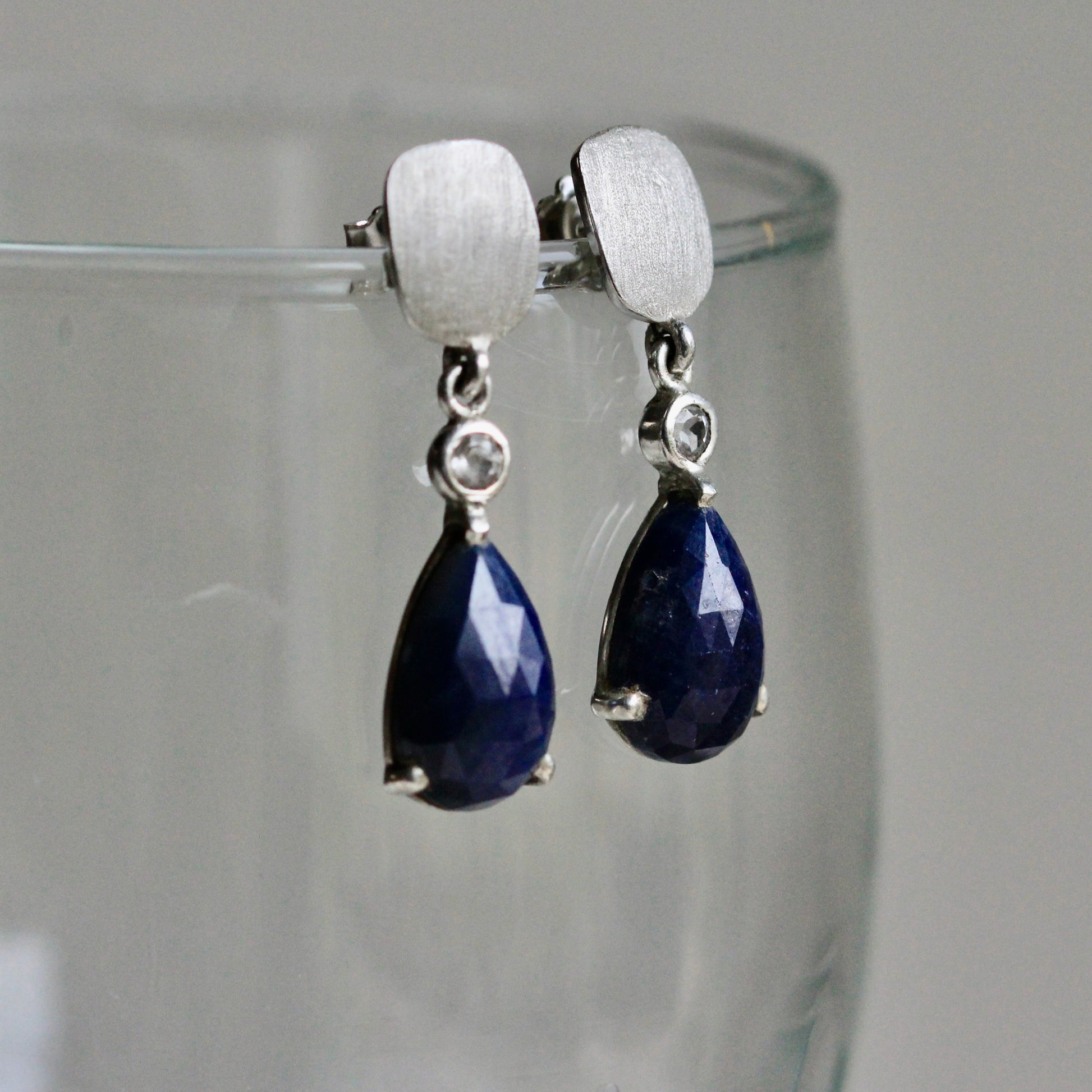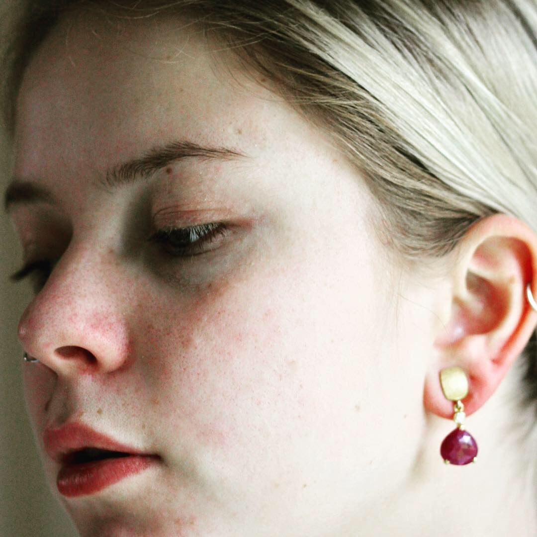 The top of this earring is a satin textured and slightly curved gold plated silver stud from which hangs a beautiful white topaz stone followed by a natural ruby teardrop.